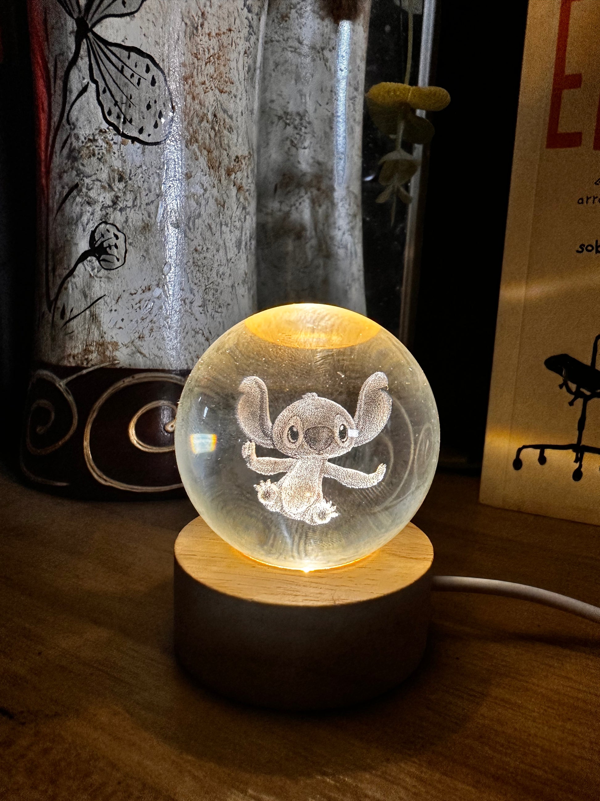 The stitch sphere night light features a beautifully engraved 6 cm crystal sphere resting on a smooth 2 cm wooden base — a small detail that makes a big difference.